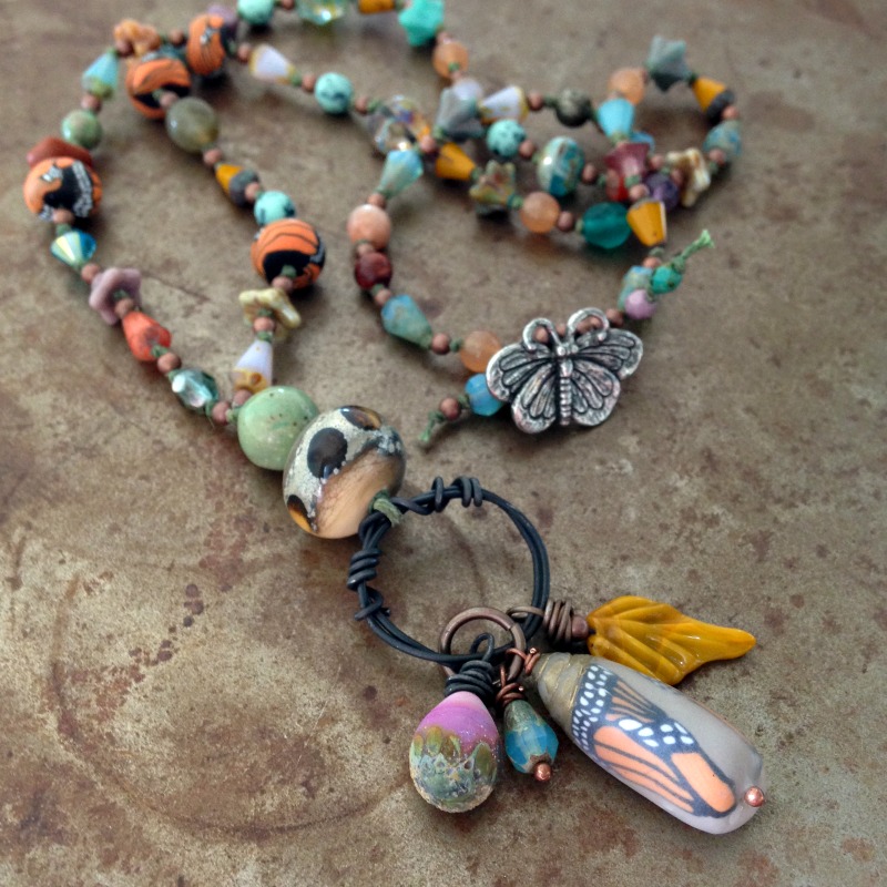 The beaded portion of the necklace - my soup - combines Czech glass, crystal, a few stones and copper beads knotted on green waxed linen. I wanted the necklace to feel like a butterfly garden, speckled with blooms and wings. The clasp is a pewter button from Green Girl Studios.